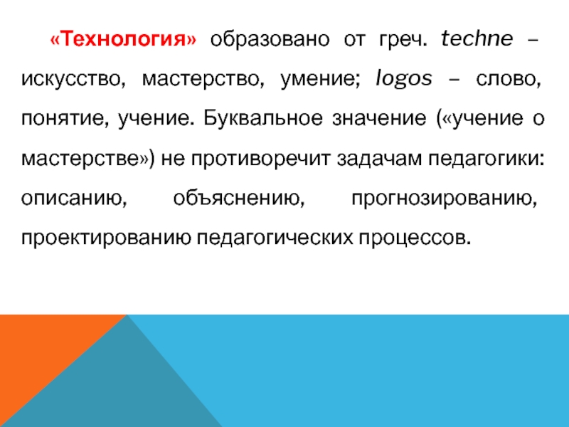 слово, понятие, учение. Буквальное значение («учение о мастерстве») не противоречит задачам педагогики: описанию, объяснению, прогнозированию, проектированию педагогических процессов.
