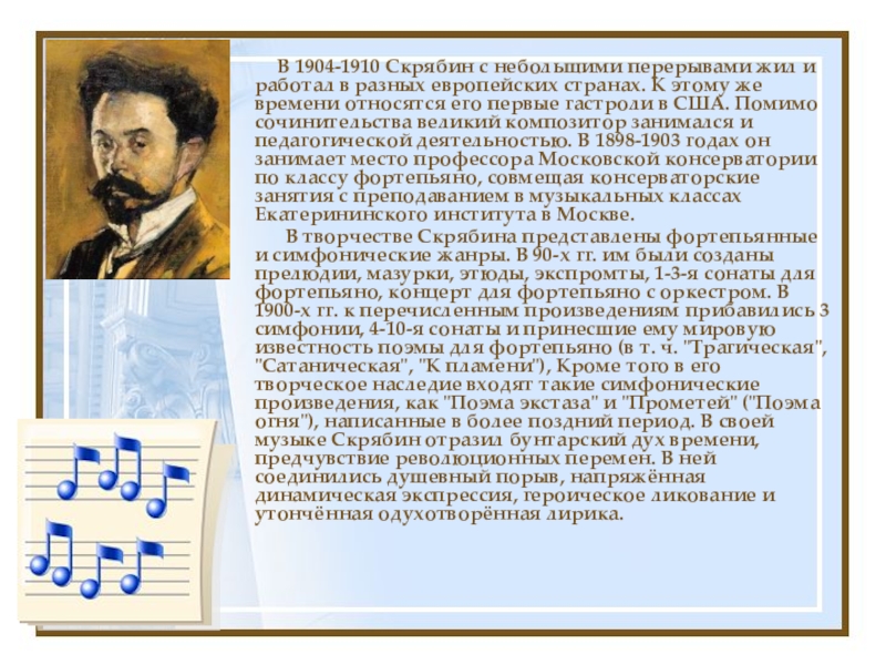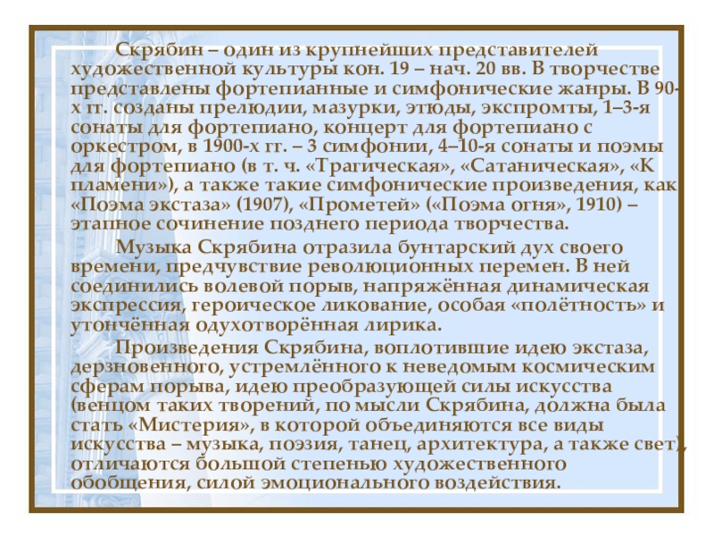 нач. 20 вв. В творчестве представлены фортепианные и симфонические жанры. В 90-х гг. созданы прелюдии, мазурки, этюды, экспромты, 1–3-я сонаты для фортепиано, концерт для фортепиано с оркестром, в 1900-х гг. – 3 симфонии, 4–10-я сонаты и поэмы для фортепиано (в т. ч. «Трагическая», «Сатаническая», «К пламени»), а также такие симфонические произведения, как «Поэма экстаза» (1907), «Прометей» («Поэма огня», 1910) – этапное сочинение позднего периода творчества.