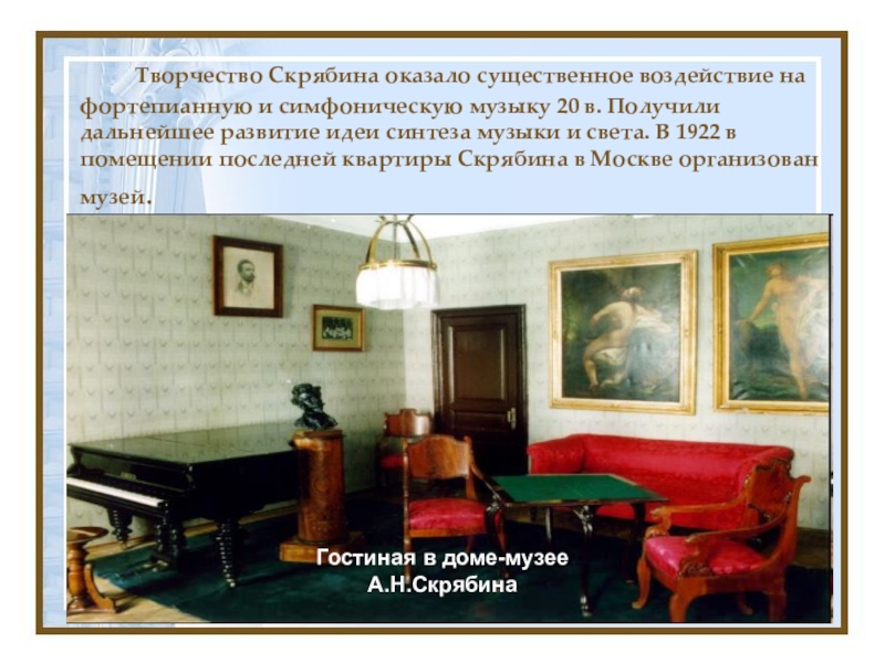 в. Получили дальнейшее развитие идеи синтеза музыки и света. В 1922 в помещении последней квартиры Скрябина в Москве организован музей.