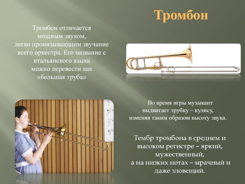 Тембр тромбона в среднем и высоком регистре – яркий, мужественный,