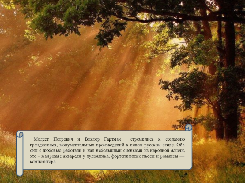 Слайд 4Модест Петрович и Виктор Гартман стремились к созданию грандиозных, монументальных произведений