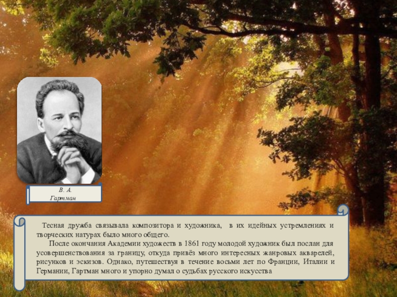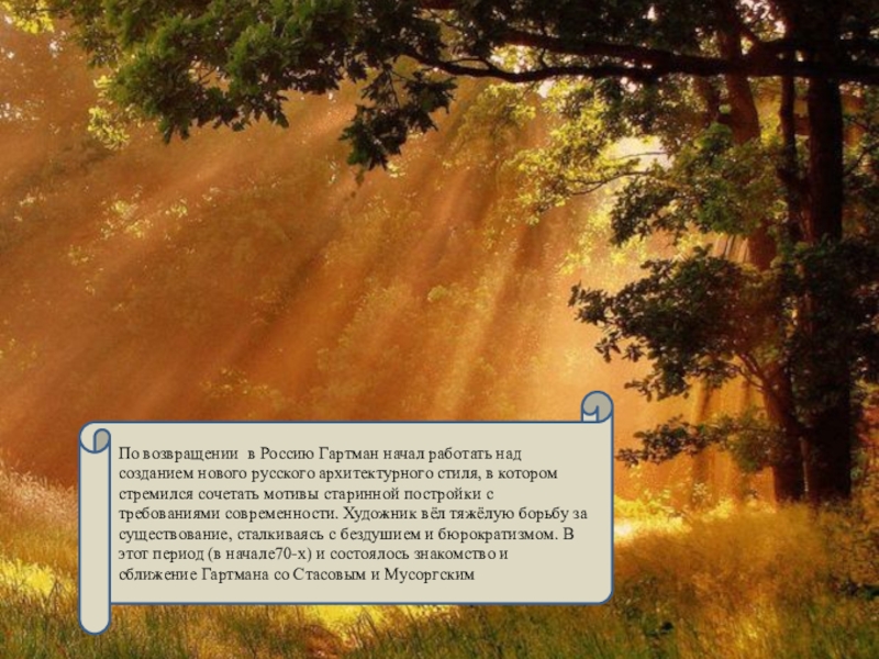 архитектурного стиля, в котором стремился сочетать мотивы старинной постройки с требованиями современности. Художник вёл тяжёлую борьбу за существование, сталкиваясь с бездушием и бюрократизмом. В этот период (в начале70-х) и состоялось знакомство и сближение Гартмана со Стасовым и Мусоргским