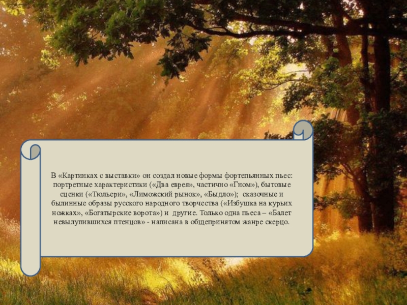Слайд 12В «Картинках с выставки» он создал новые формы фортепьянных пьес: портретные