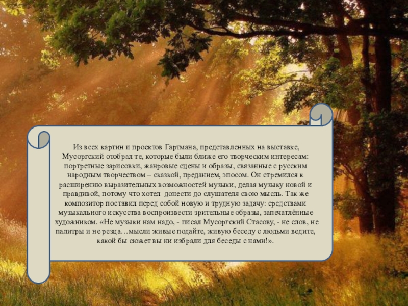 отобрал те, которые были ближе его творческим интересам: портретные зарисовки, жанровые сцены и образы, связанные с русским народным творчеством – сказкой, преданием, эпосом. Он стремился к расширению выразительных возможностей музыки, делая музыку новой и правдивой, потому что хотел донести до слушателя свою мысль. Так же композитор поставил перед собой новую и трудную задачу: средствами музыкального искусства воспроизвести зрительные образы, запечатлённые художником. «Не музыки нам надо, - писал Мусоргский Стасову, - не слов, не палитры и не резца…мысли живые подайте, живую беседу с людьми ведите, какой бы сюжет вы ни избрали для беседы с нами!».