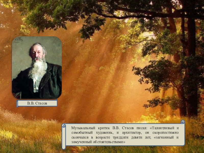 Слайд 9Музыкальный критик В.В. Стасов писал: «Талантливый и самобытный художник, и архитектор,