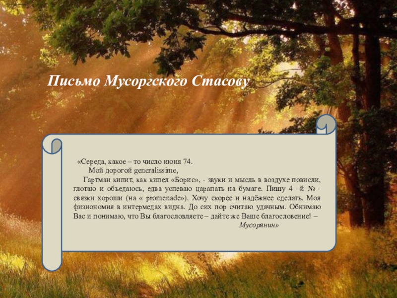 Гартман кипит, как кипел «Борис», - звуки и мысль в воздухе повисли, глотаю и объедаюсь, едва успеваю царапать на бумаге. Пишу 4 –й № - связки хороши (на « promenade»). Хочу скорее и надёжнее сделать. Моя физиономия в интермедах видна. До сих пор считаю удачным. Обнимаю Вас и понимаю, что Вы благословляете – дайте же Ваше благословение! –