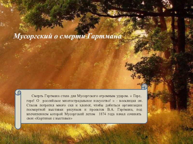 « Горе, горе! О российское многострадальное искусство! » - восклицал он. Стасов потратил много сил и хлопот, чтобы добиться организации посмертной выставки рисунков и проектов В.А. Гартмана, под впечатлением которой Мусоргский летом 1874 года начал сочинять свои «Картинки с выставки»