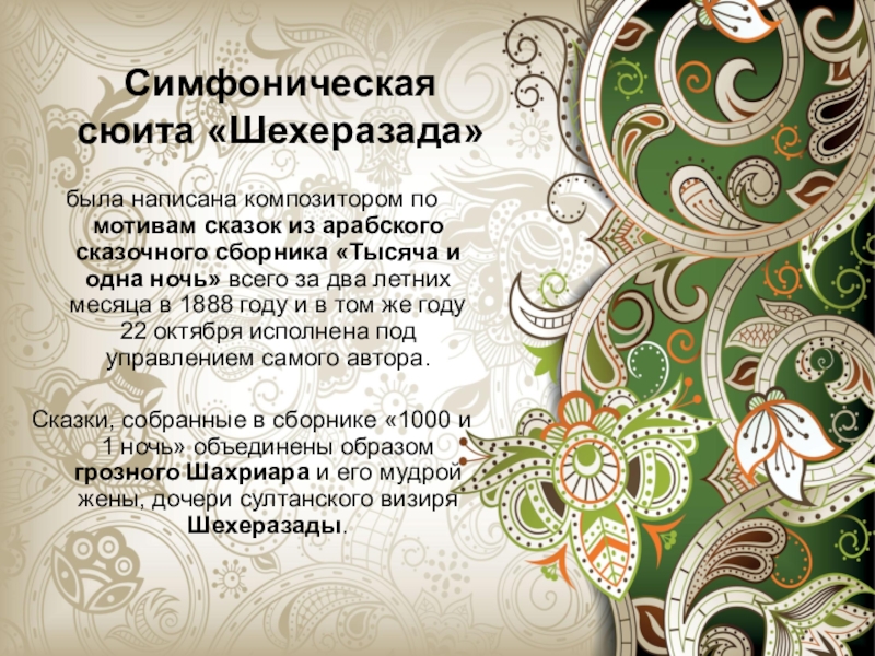 сборника «Тысяча и одна ночь» всего за два летних месяца в 1888 году и в том же году 22 октября исполнена под управлением самого автора.