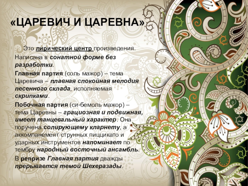 Главная партия (соль мажор) – тема Царевича – плавная спокойная мелодия песенного склада, исполняемая скрипками.