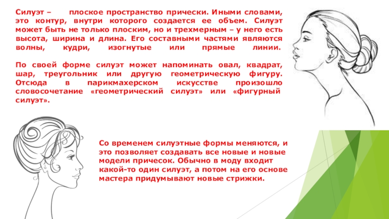 Со временем силуэтные формы меняются, и это позволяет создавать все новые и новые модели причесок. Обычно в моду входит какой-то один силуэт, а потом на его основе мастера придумывают новые стрижки.