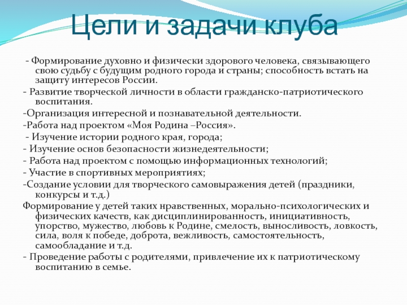 - Развитие творческой личности в области гражданско-патриотического воспитания.