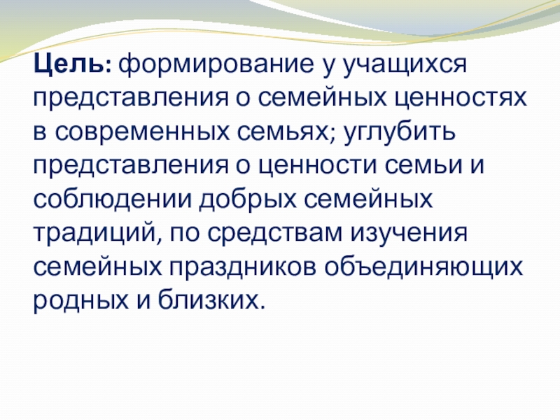 Слайд 2Цель: формирование у учащихся представления о семейных ценностях в современных семьях;