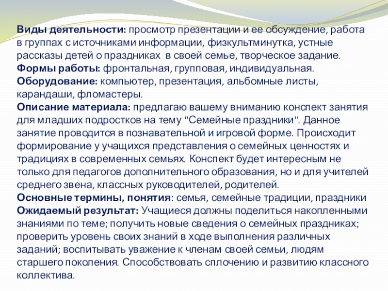 Описание материала: предлагаю вашему вниманию конспект занятия для младших подростков на тему "Семейные праздники". Данное занятие проводится в познавательной и игровой форме. Происходит формирование у учащихся представления о семейных ценностях и традициях в современных семьях. Конспект будет интересным не только для педагогов дополнительного образования, но и для учителей среднего звена, классных руководителей, родителей.