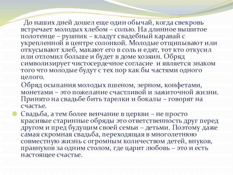 свекровь встречает молодых хлебом – солью. На длинное вышитое полотенце – рушник – кладут свадебный каравай с укрепленной в центре солонкой. Молодые отщипывают или откусывают хлеб, макают его в соль и едят, тот кто откусил или отломил больше и будет в доме хозяин. Обряд символизирует чистосердечное согласие и является знаком того что молодые будут с тех пор как бы частями одного целого.