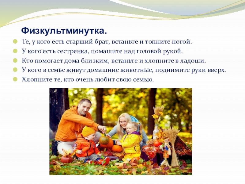 источниками информации, физкультминутка, устные рассказы детей о праздниках в своей семье, творческое задание.