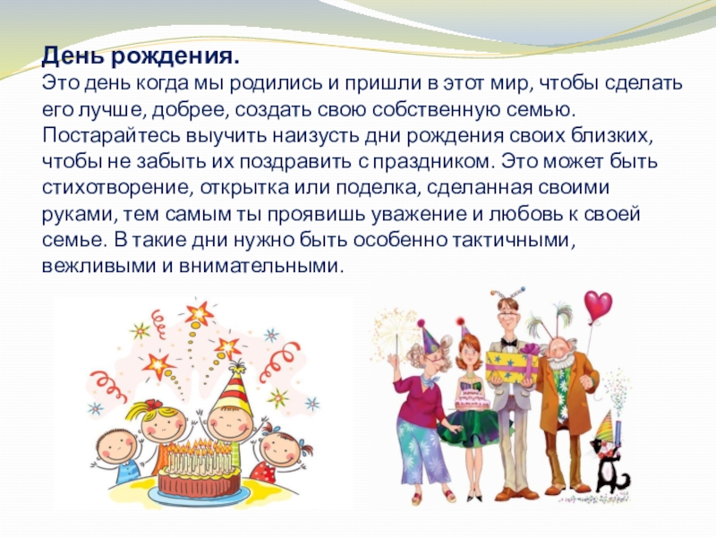чтобы сделать его лучше, добрее, создать свою собственную семью. Постарайтесь выучить наизусть дни рождения своих близких, чтобы не забыть их поздравить с праздником. Это может быть стихотворение, открытка или поделка, сделанная своими руками, тем самым ты проявишь уважение и любовь к своей семье. В такие дни нужно быть особенно тактичными, вежливыми и внимательными.