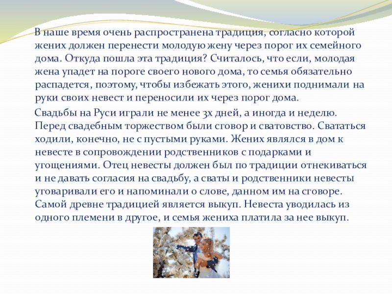 должен перенести молодую жену через порог их семейного дома. Откуда пошла эта традиция? Считалось, что если, молодая жена упадет на пороге своего нового дома, то семья обязательно распадется, поэтому, чтобы избежать этого, женихи поднимали на руки своих невест и переносили их через порог дома.
