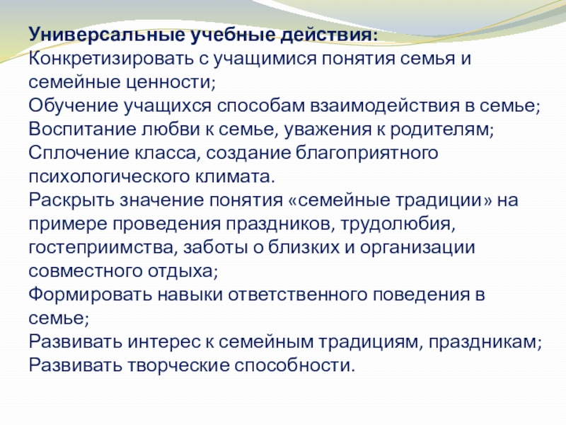Раскрыть значение понятия «семейные традиции» на примере проведения праздников, трудолюбия, гостеприимства, заботы о близких и организации совместного отдыха;