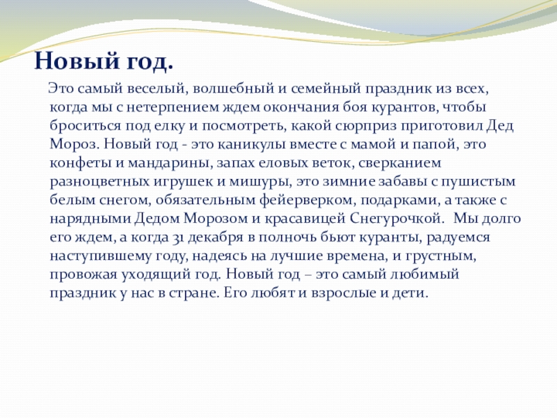 из всех, когда мы с нетерпением ждем окончания боя курантов, чтобы броситься под елку и посмотреть, какой сюрприз приготовил Дед Мороз. Новый год - это каникулы вместе с мамой и папой, это конфеты и мандарины, запах еловых веток, сверканием разноцветных игрушек и мишуры, это зимние забавы с пушистым белым снегом, обязательным фейерверком, подарками, а также с нарядными Дедом Морозом и красавицей Снегурочкой. Мы долго его ждем, а когда 31 декабря в полночь бьют куранты, радуемся наступившему году, надеясь на лучшие времена, и грустным, провожая уходящий год. Новый год – это самый любимый праздник у нас в стране. Его любят и взрослые и дети.