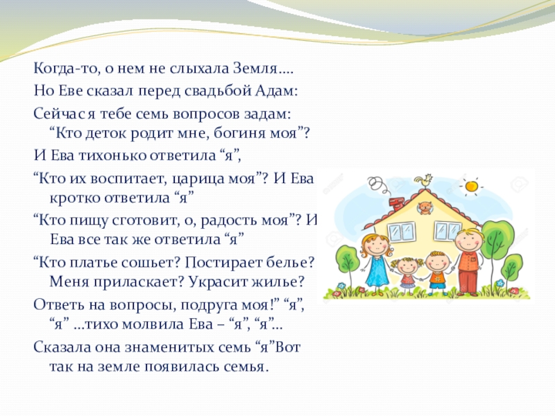 Сказала она знаменитых семь “я”Вот так на земле появилась семья.