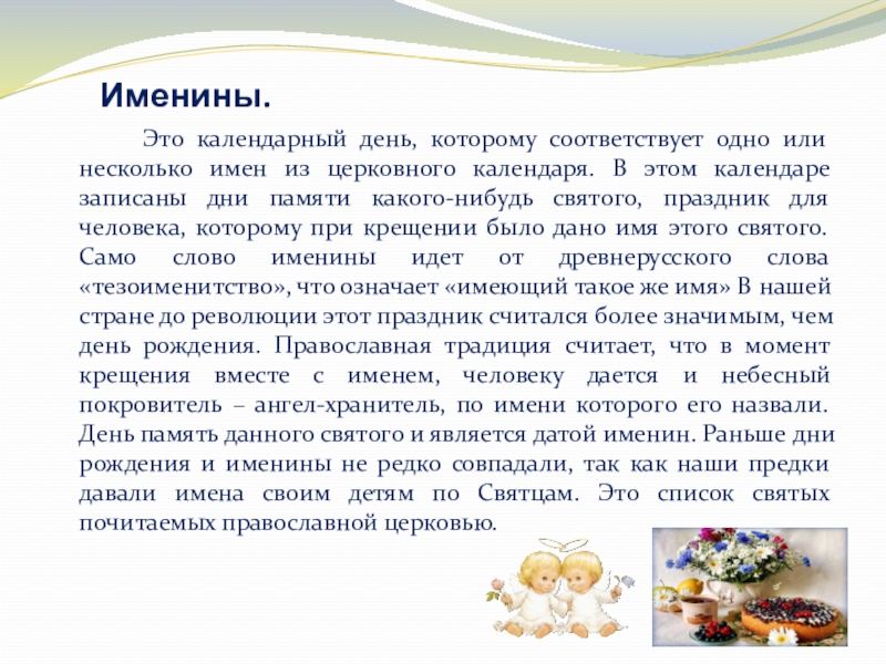 день, которому соответствует одно или несколько имен из церковного календаря. В этом календаре записаны дни памяти какого-нибудь святого, праздник для человека, которому при крещении было дано имя этого святого. Само слово именины идет от древнерусского слова «тезоименитство», что означает «имеющий такое же имя» В нашей стране до революции этот праздник считался более значимым, чем день рождения. Православная традиция считает, что в момент крещения вместе с именем, человеку дается и небесный покровитель – ангел-хранитель, по имени которого его назвали. День память данного святого и является датой именин. Раньше дни рождения и именины не редко совпадали, так как наши предки давали имена своим детям по Святцам. Это список святых почитаемых православной церковью.