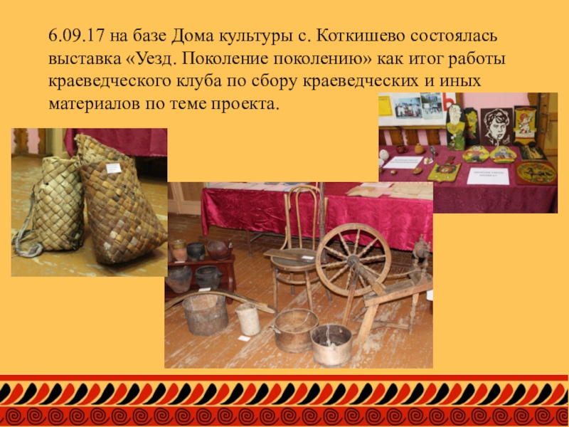 6.09.17 на базе Дома культуры с. Коткишево состоялась выставка «Уезд. Поколение поколению» как итог работы краеведческого клуба
