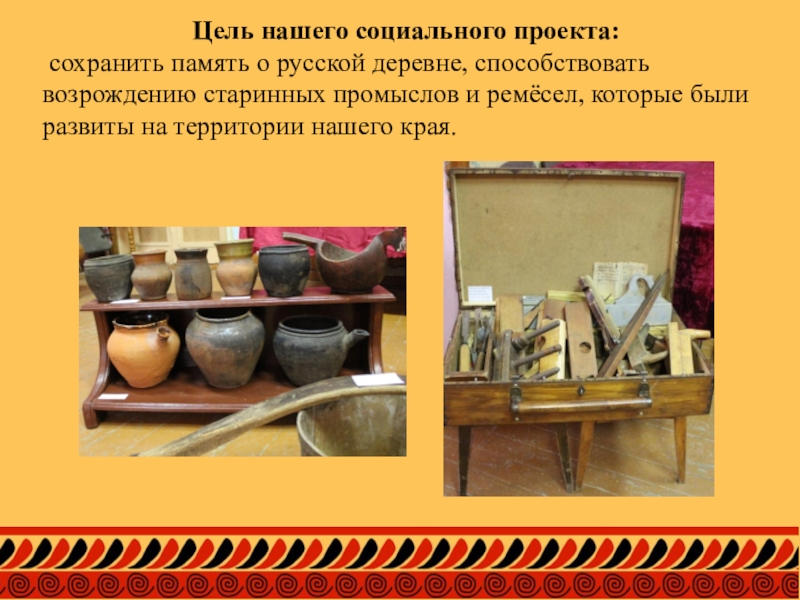 Цель нашего социального проекта: сохранить память о русской деревне, способствовать возрождению старинных промыслов и ремёсел, которые были