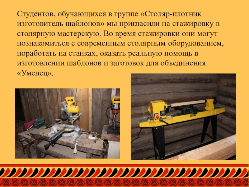 Слайд 10Студентов, обучающихся в группе «Столяр-плотник изготовитель шаблонов» мы пригласили на стажировку