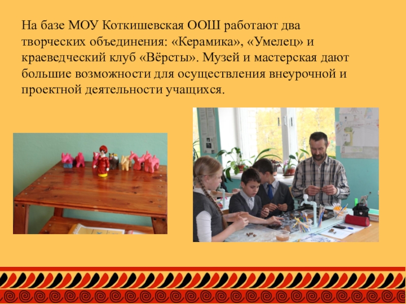 Слайд 5На базе МОУ Коткишевская ООШ работают два творческих объединения: «Керамика», «Умелец»