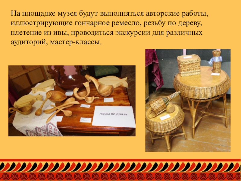 Слайд 4На площадке музея будут выполняться авторские работы, иллюстрирующие гончарное ремесло, резьбу