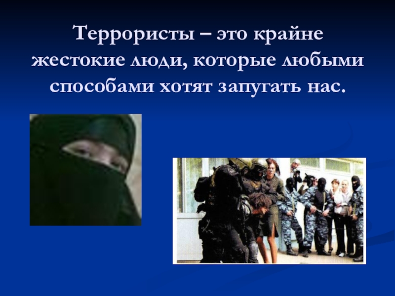 Слайд 2Террористы – это крайне жестокие люди, которые любыми способами хотят запугать