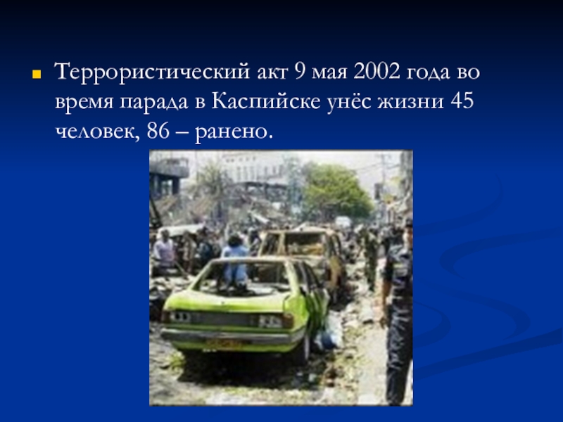 Террористический акт 9 мая 2002 года во время парада в Каспийске унёс жизни 45 человек, 86 –