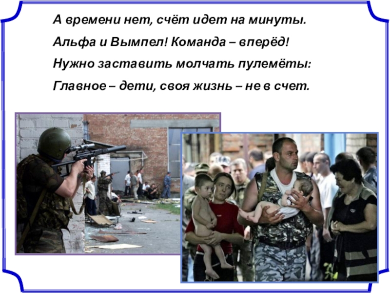 А времени нет, счёт идет на минуты.Альфа и Вымпел! Команда – вперёд!Нужно заставить молчать пулемёты:Главное – дети,