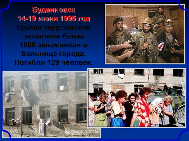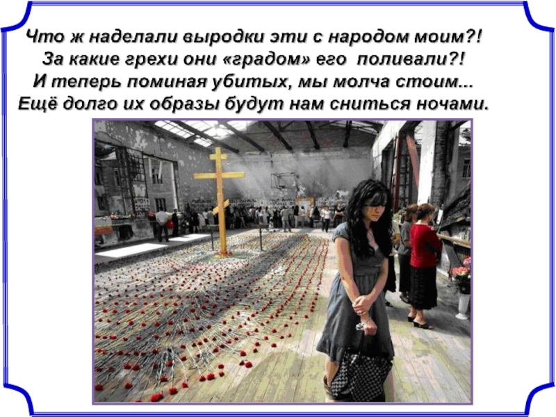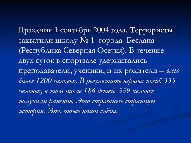 1 города Беслана (Республика Северная Осетия). В течение двух суток в спортзале удерживались преподаватели, ученики, и их родители – всего более 1200 человек. В результате взрыва погиб 335 человек, в том числе 186 детей. 559 человек получили ранения. Это страшные страницы истории. Это тоже наши слёзы.