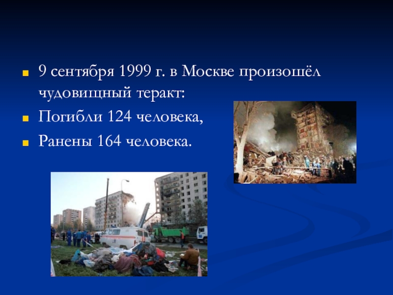 9 сентября 1999 г. в Москве произошёл чудовищный теракт:Погибли 124 человека,Ранены 164 человека.