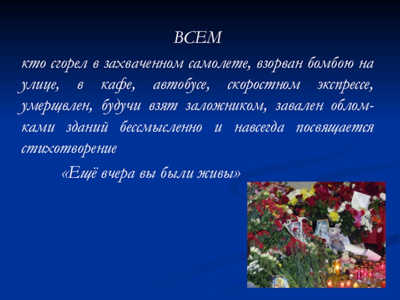 автобусе, скоростном экспрессе, умерщвлен, будучи взят заложником, завален облом-ками зданий бессмысленно и навсегда посвящается стихотворение