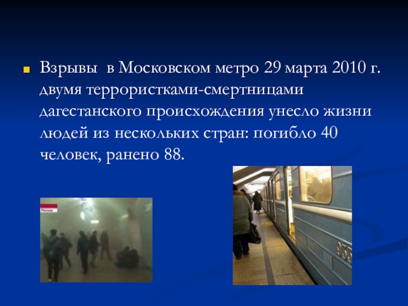 Взрывы в Московском метро 29 марта 2010 г. двумя террористками-смертницами дагестанского происхождения унесло жизни людей из нескольких