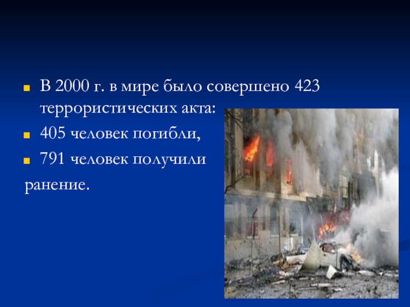 В 2000 г. в мире было совершено 423 террористических акта:405 человек погибли,791 человек получили ранение.