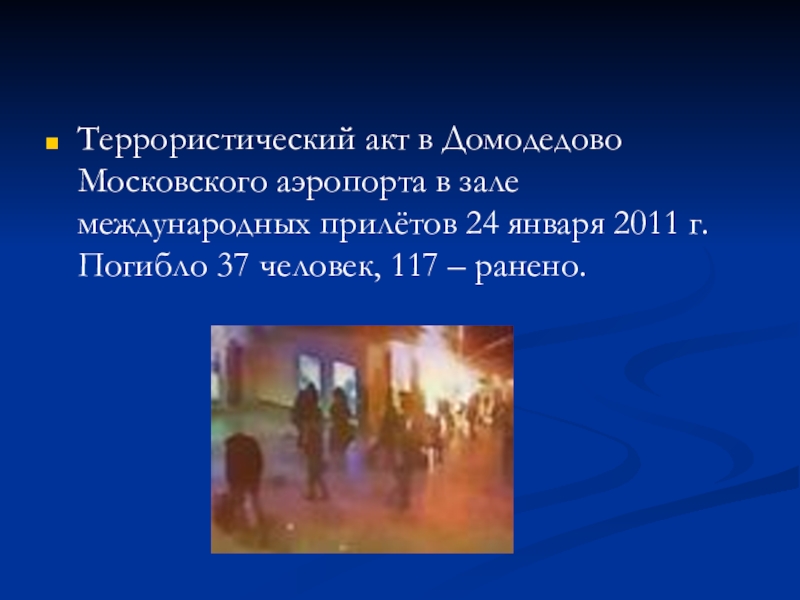 Террористический акт в Домодедово Московского аэропорта в зале международных прилётов 24 января 2011 г. Погибло 37 человек,