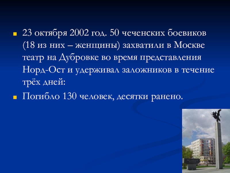 23 октября 2002 год. 50 чеченских боевиков (18 из них – женщины) захватили в Москве театр на