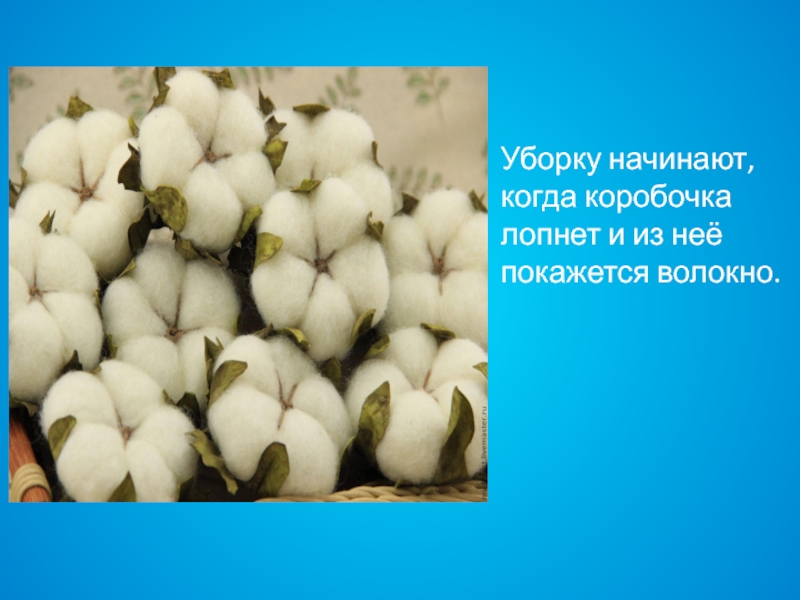 Слайд 8Уборку начинают, когда коробочка лопнет и из неё покажется волокно.