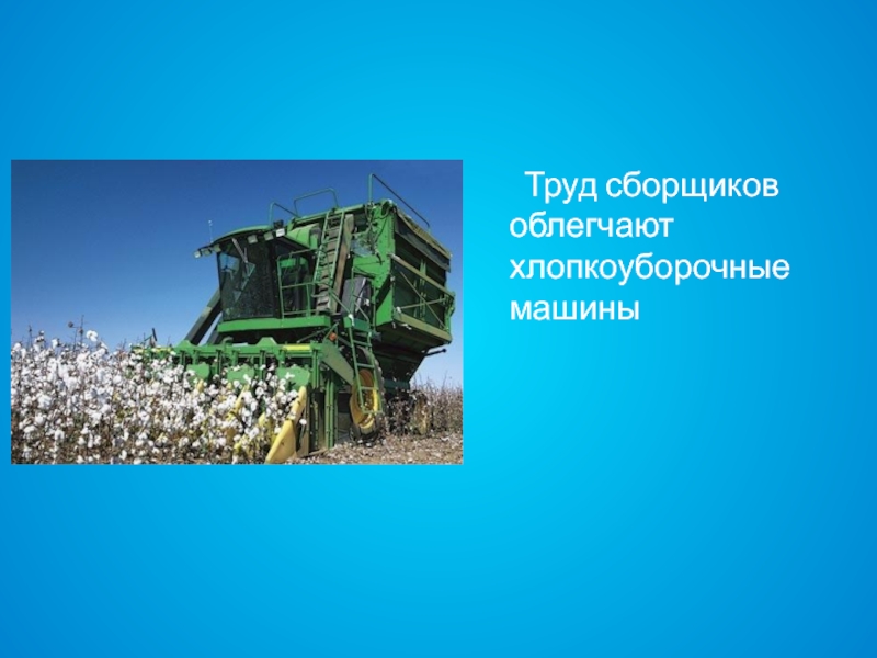 Слайд 10 Труд сборщиков облегчают хлопкоуборочные машины