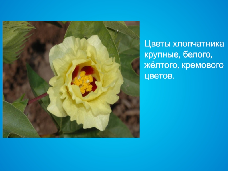 Слайд 4Цветы хлопчатника крупные, белого, жёлтого, кремового цветов.