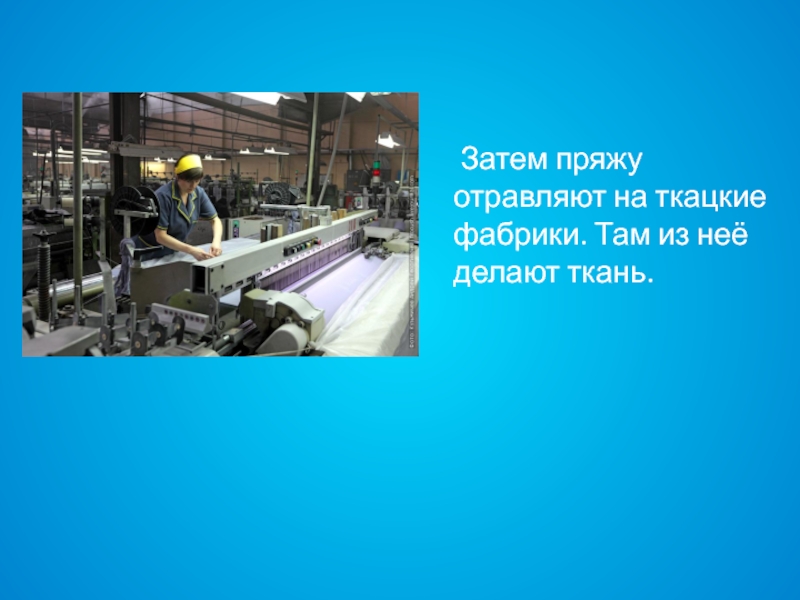 Слайд 13 Затем пряжу отравляют на ткацкие фабрики. Там из неё делают
