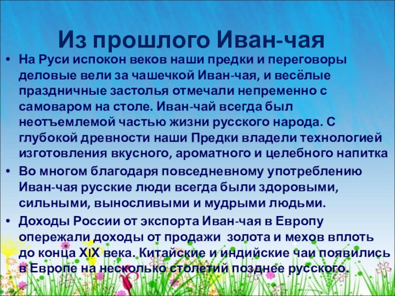 Из прошлого Иван-чаяНа Руси испокон веков наши предки и переговоры деловые вели за чашечкой Иван-чая, и весёлые