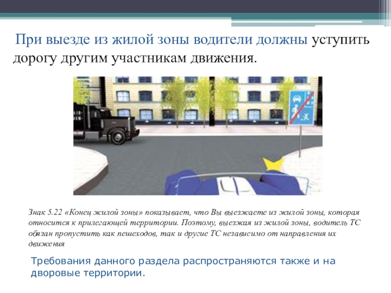 Знак 5.22 «Конец жилой зоны» показывает, что Вы выезжаете из жилой зоны, которая относится к прилегающей территории. Поэтому, выезжая из жилой зоны, водитель ТС обязан пропустить как пешеходов, так и другие ТС независимо от направления их движения