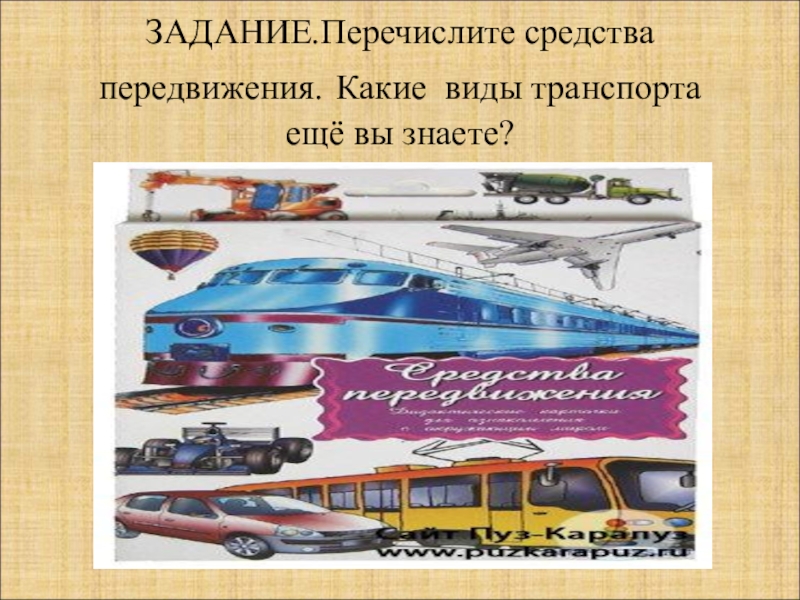 Слайд 5ЗАДАНИЕ.Перечислите средства передвижения. Какие виды транспорта ещё вы знаете?