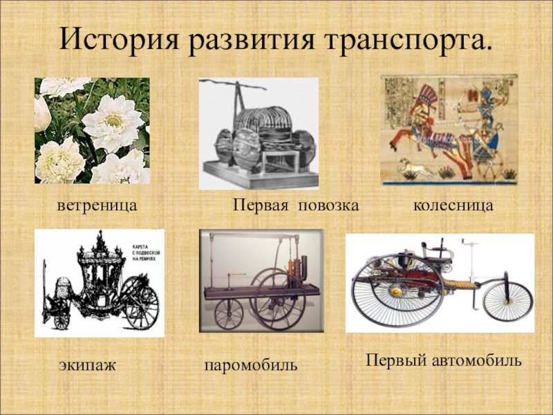 История развития транспорта.ветреницаПервая повозка колесницапаромобиль экипаж Первый автомобиль