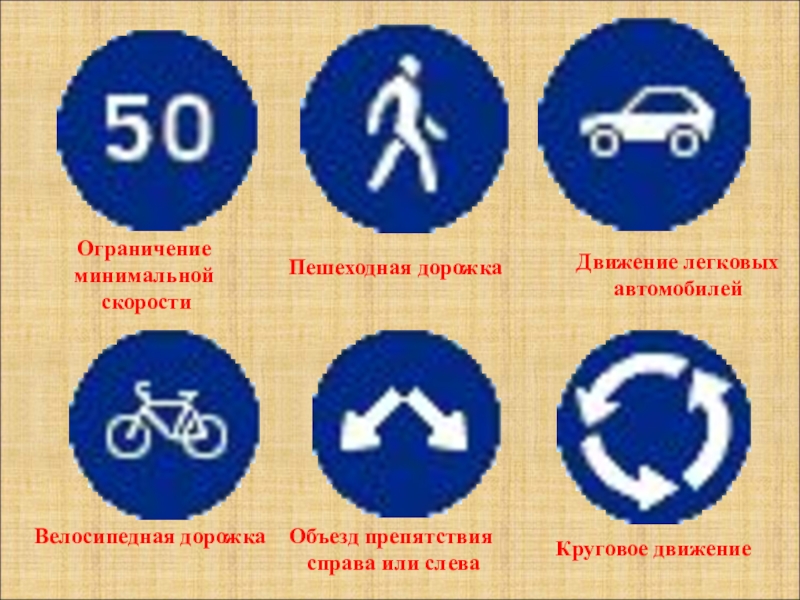 Ограничение минимальной скорости Пешеходная дорожка Движение легковых автомобилей Велосипедная дорожка  Объезд препятствия справа или слева Круговое