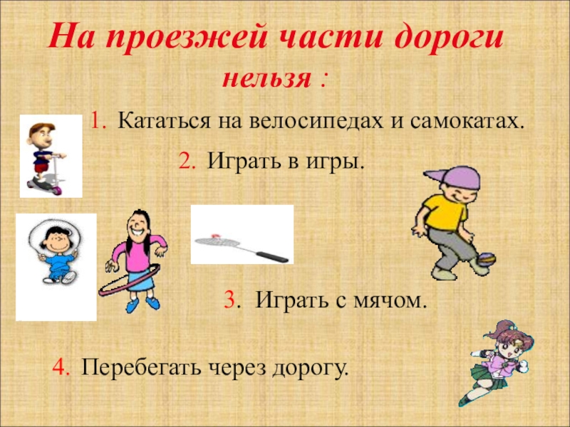 На проезжей части дороги нельзя : 1. Кататься на велосипедах и самокатах.2. Играть в игры.3. Играть с